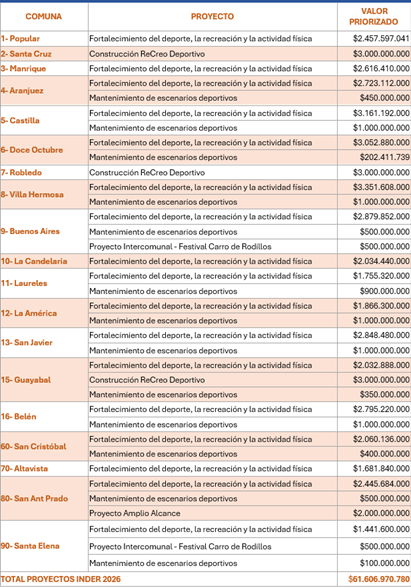 Para el año 2026, se asignaron $61.606.970.780 para la ejecución de proyectos a cargo del INDER Medellín. Estos recursos están orientados a:
